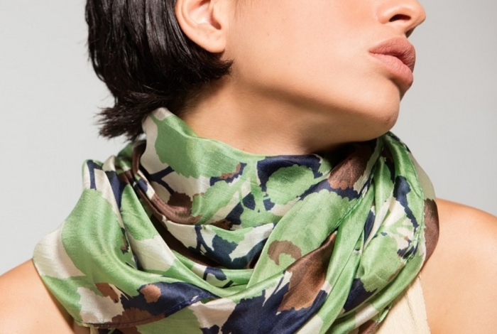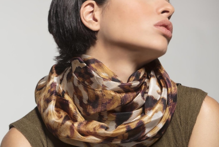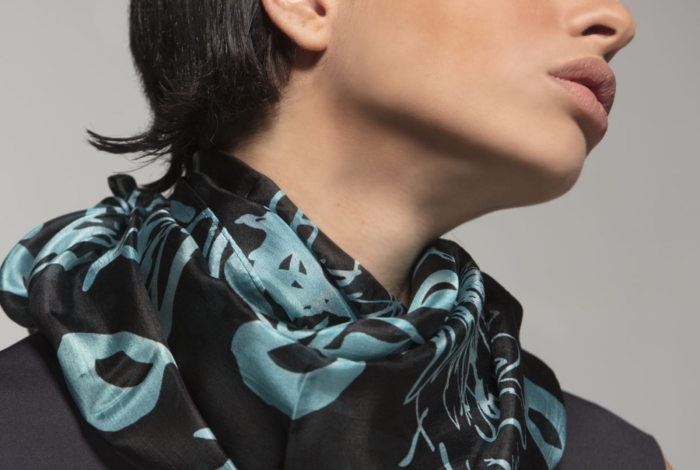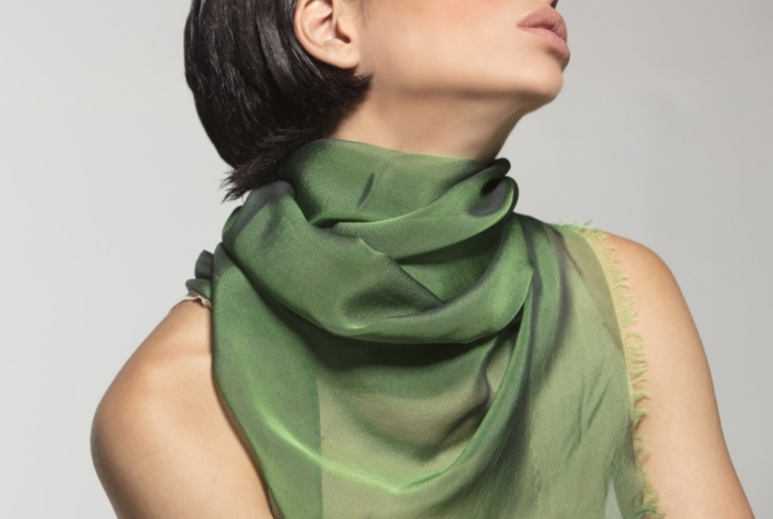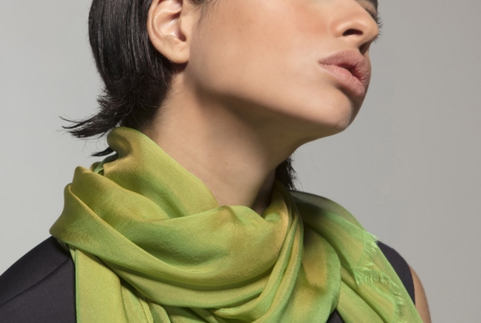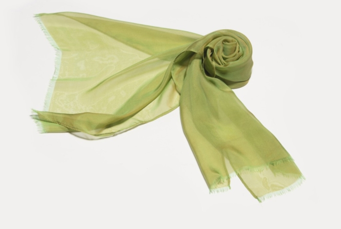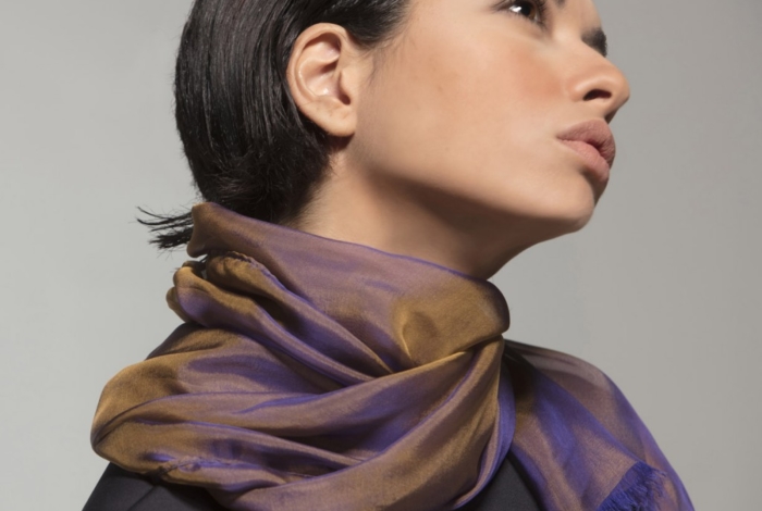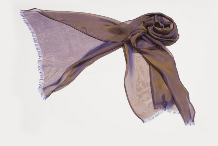 Echarpe que apresenta um efeito mágico (por isso Mahô, que significa mágico em japonês), tecido 100% seda com fios em duas cores diferentes.